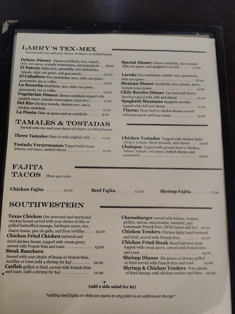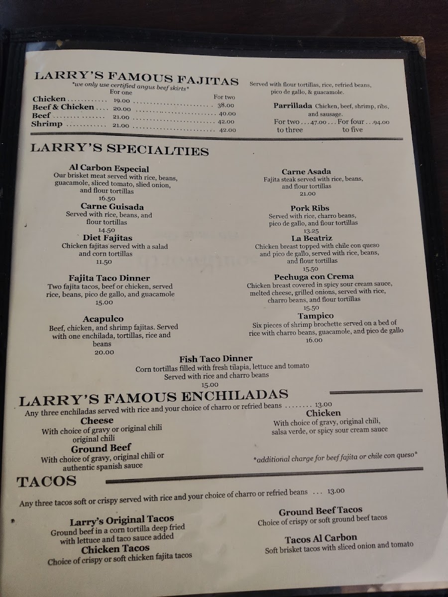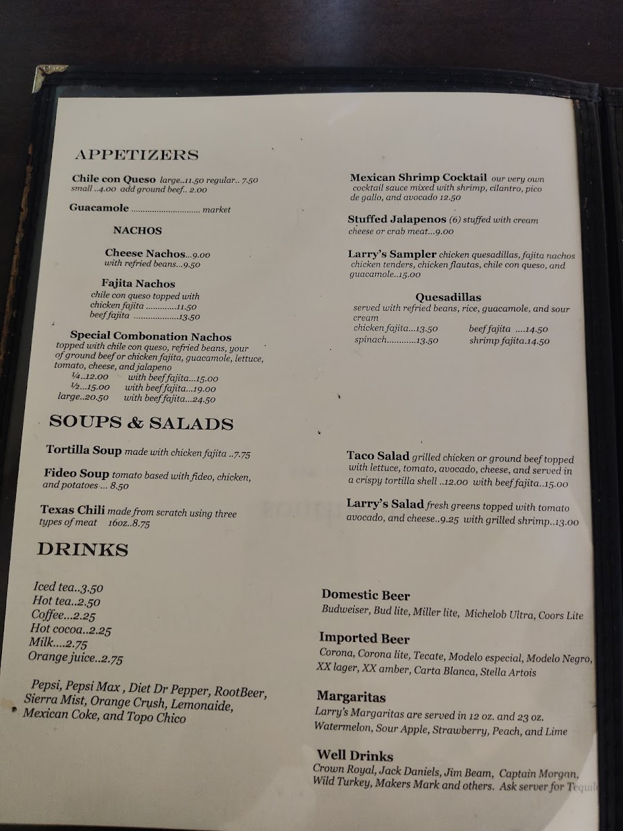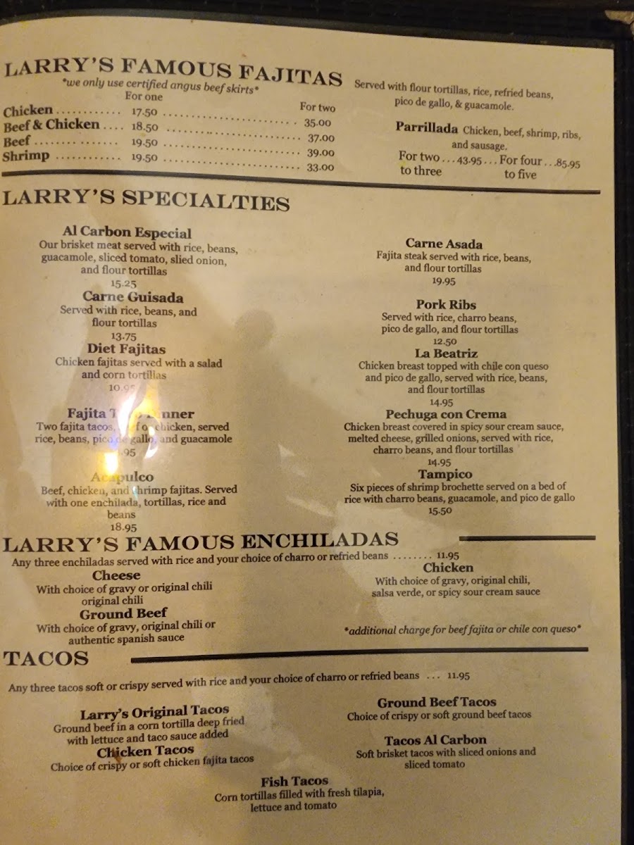 The menu at Larry’s Original Mexican Restaurant offers a straightforward selection of classic Tex-Mex dishes and comforting drinks, reflecting the casual and welcoming atmosphere of this Richmond staple. Whether you're stopping by for a relaxed lunch or a leisurely dinner, the menu’s focus on familiar flavors and generous portions fits well with the easygoing vibe of the space.
