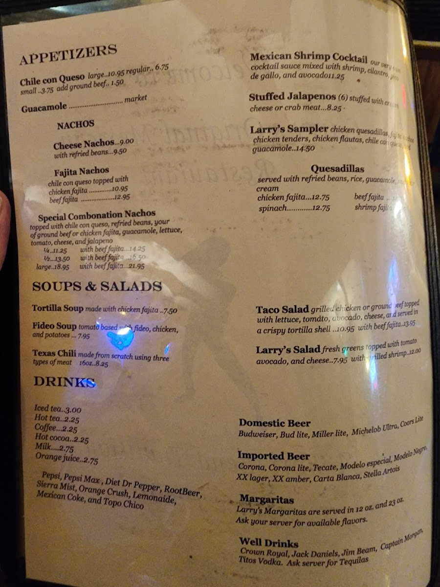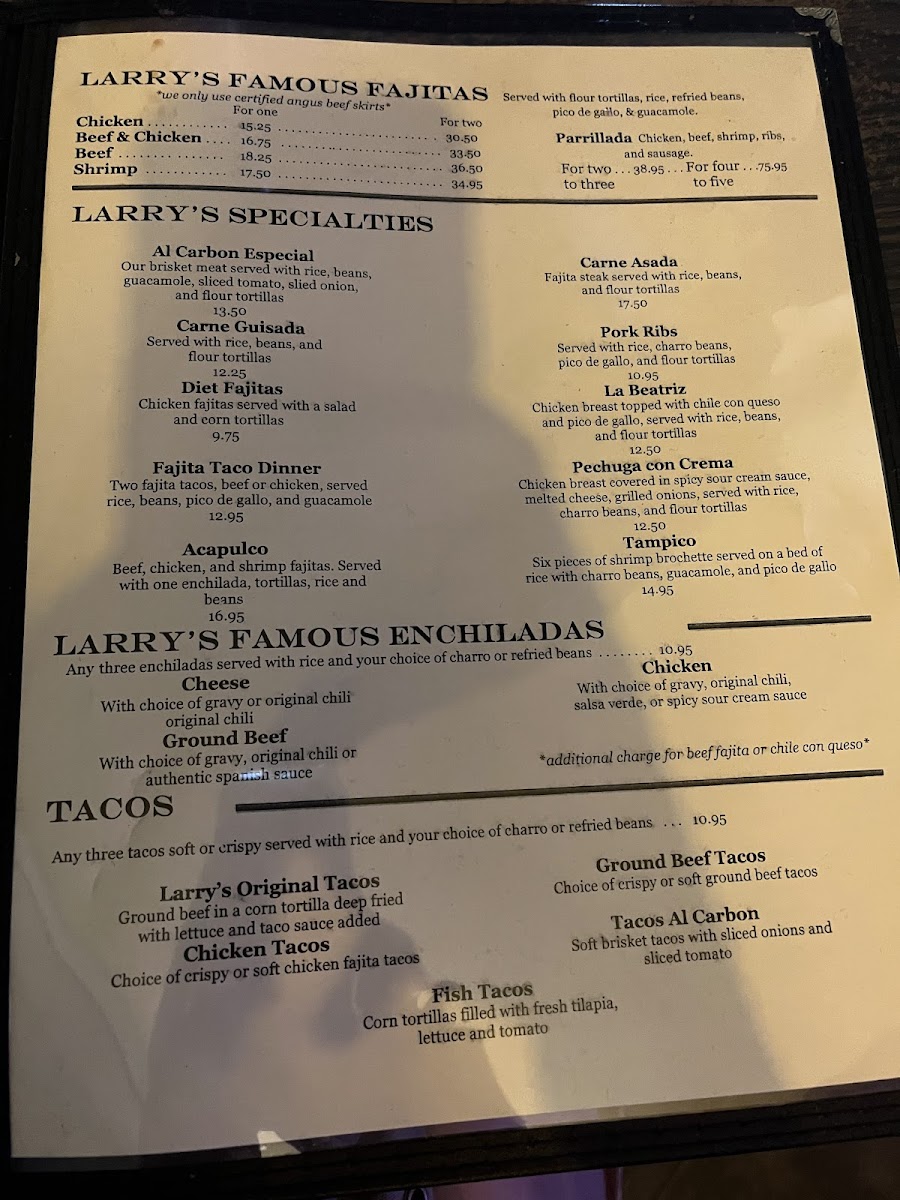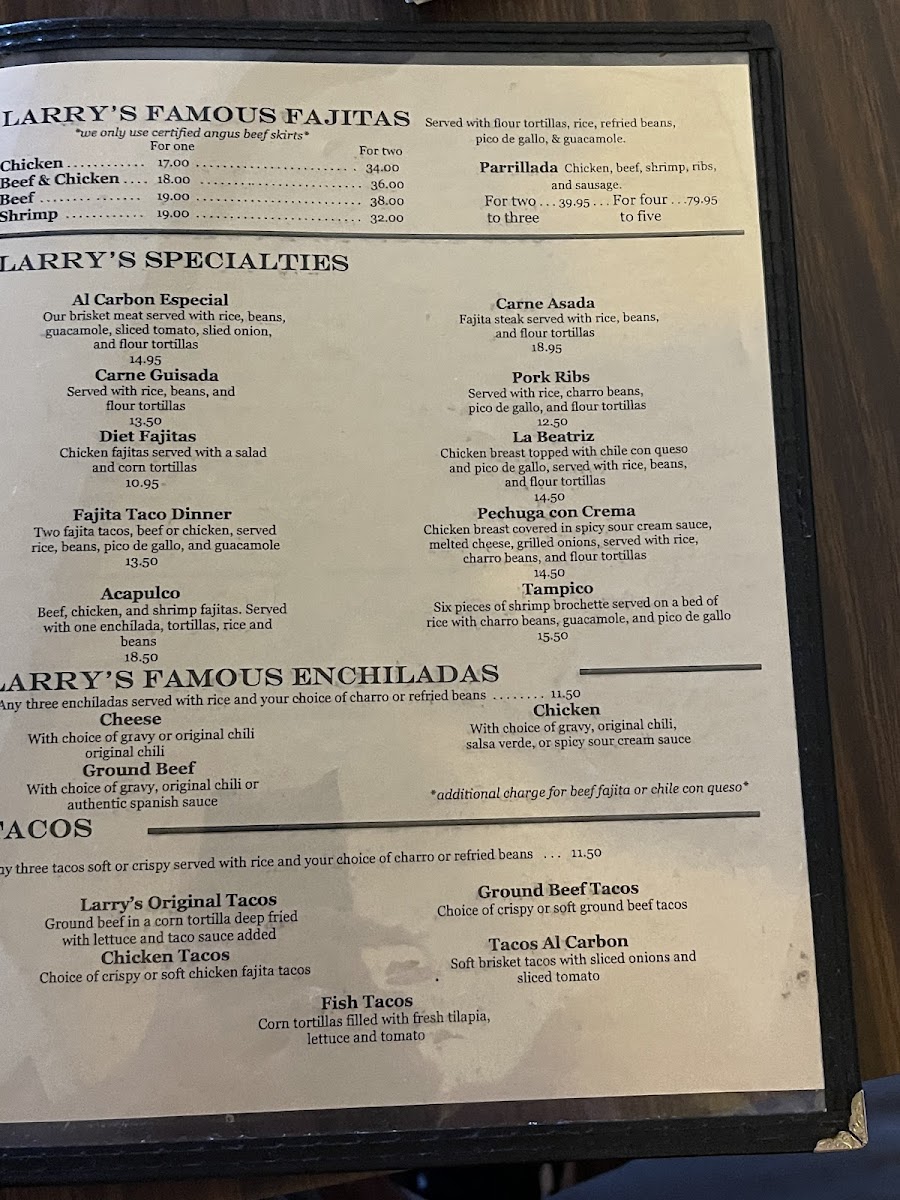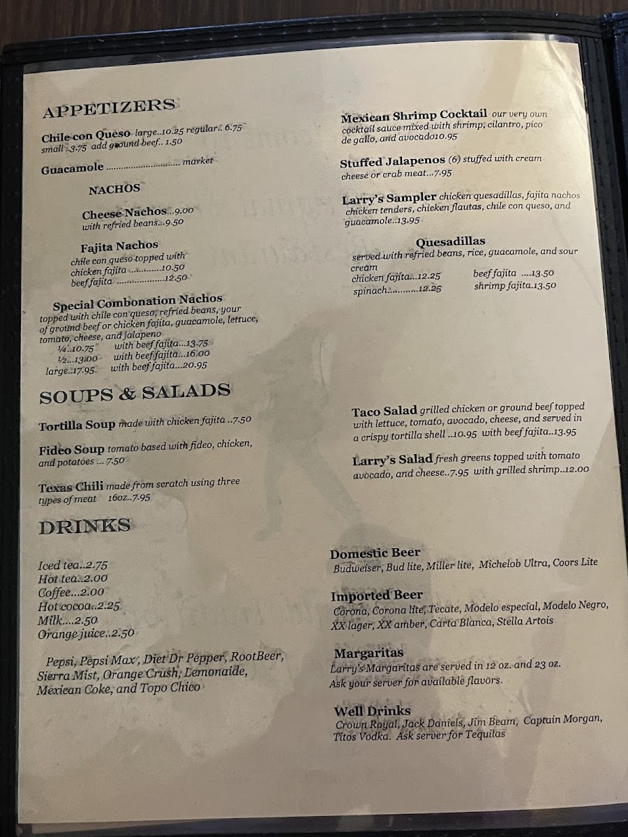 The menu at Larry’s Original Mexican Restaurant offers a straightforward selection of classic Tex-Mex dishes and comforting drinks, reflecting the casual and welcoming atmosphere of this Richmond staple. Whether you're stopping by for a relaxed lunch or a leisurely dinner, the menu’s focus on familiar flavors and generous portions fits well with the easygoing vibe of the space.